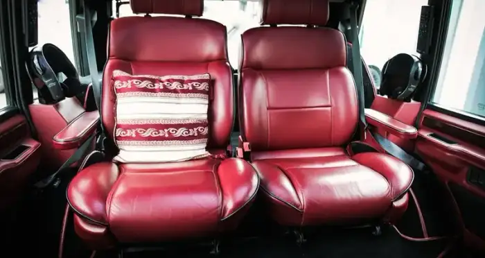 В салоне инженеры установили три отдельных кресла, украшенные красной кожей и натуральным деревом. Кроме того, внедорожник оснастили перегородкой между водителем и пассажирами, а также двумя телевизорами с проигрывателем видеокассет и CD-плеером.