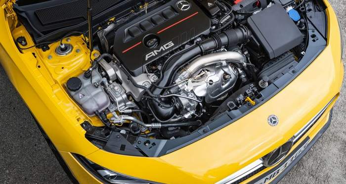 Новый Mercedes-AMG A35 оснащается модифицированным двухлитровым турбо-мотором M260 – тем самым, что прячется под капотом не-AMG модели. Однако в спортивном исполнении этот мотор развивает 305 л.с. и 400 номов. Двигатель соединен с семиступенчатым “роботом” с двойным сцеплением AMG Speedshift DCT 7G. Горячий хэтчбек имеет полноприводную трансмиссию.
