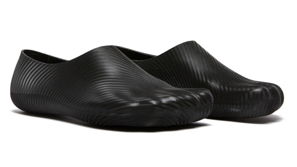 Модные ботинки Balenciaga Ultra Flat Mules выглядят, как затвердевшие носки, причем волокна карбоновой поверхности лишь усиливают этот эффект. Обувь изготовлена из термопластичного полиуретана, а сверху покрыта карбоном.