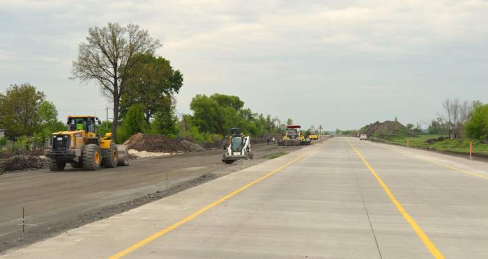 Дорогу делают по новой технологии – из бетона. Ее расширят до 4 полос, общая толщина покрытия составит 1,5 метра! В частности, нижний слой – закрепленный и стабилизированный грунт имеет толщину 70 см, слой цементогрунта 30 см. Далее идут 18 см тощего бетона и 26 – тяжелого бетона. На продольных и поперечных швах на глубине 13 см вкладываются армирующие элементы.