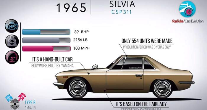 Оригинальный автомобиль можно увидеть в нижней левой части эскиза Вивера. Первое купе Silvia дебютировало на Токийском автосалоне 1964 года, а в следующем году поступило в продажу. Автомобиль представлял собой специальную модель, собранную преимущественно вручную, которая использовала те же шасси, что и Datsun Fairlady 1600 SP311. Было собрано и продано всего 554 таких машины.