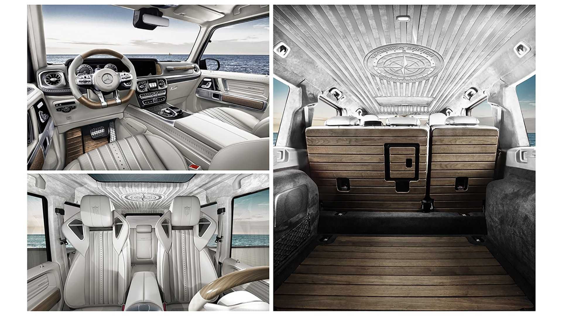 Грузовой отсек Mercedes-AMG G 63 полностью обшили древесиной, что усиливает параллели с яхтами. Кроме того, шпоном отделаны задние части сидений, а алькантара на потолке тоже имитирует деревянные планки.