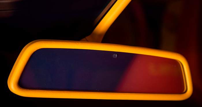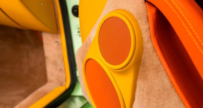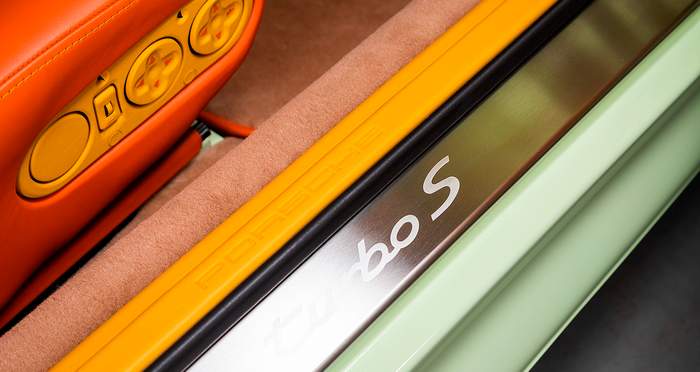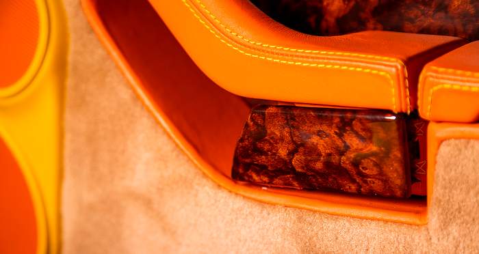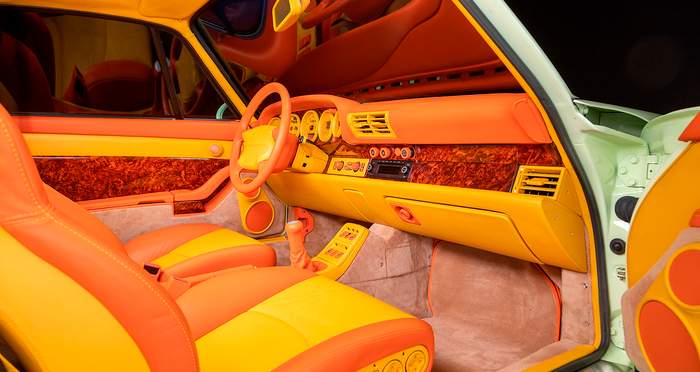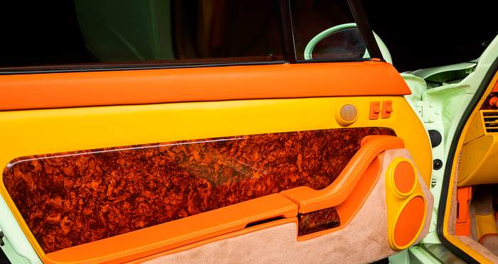 Где вещи становятся действительно странными – это двухцветный интерьер в оранжевом и желтом оттенках. Обычно нужно открывать двери, чтобы увидеть отделку салона автомобиля, но эта жгуче яркая кожа легко заметна за километр. Вблизи же можно увидеть, что два ярких цвета в салоне 911 сочетаются еще и с большим количеством деревянных панелей коричневого цвета. Дальше – больше: коврики на полу и вставки в дверях снова другого цвета, бежевого.