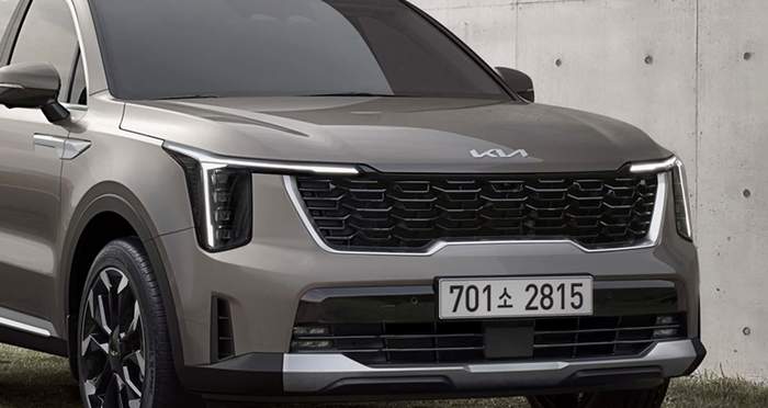 На первых официальных изображениях Sorento 2024 видно, что Kia полностью переделала переднюю панель, чтобы разместить Т-образные фары с верхней полосой дневных ходовых огней, окружающей логотип Kia. Кстати, значок больше не расположен на решетке, поскольку он был перемещен внизу капота. Решетка имеет новый вид, как и нижний воздухозаборник – по-прежнему содержит отдельные противотуманные фары. Вертикальные воздушные завесы теперь кажутся чуть больше, и мы также замечаем серебристую стойку.