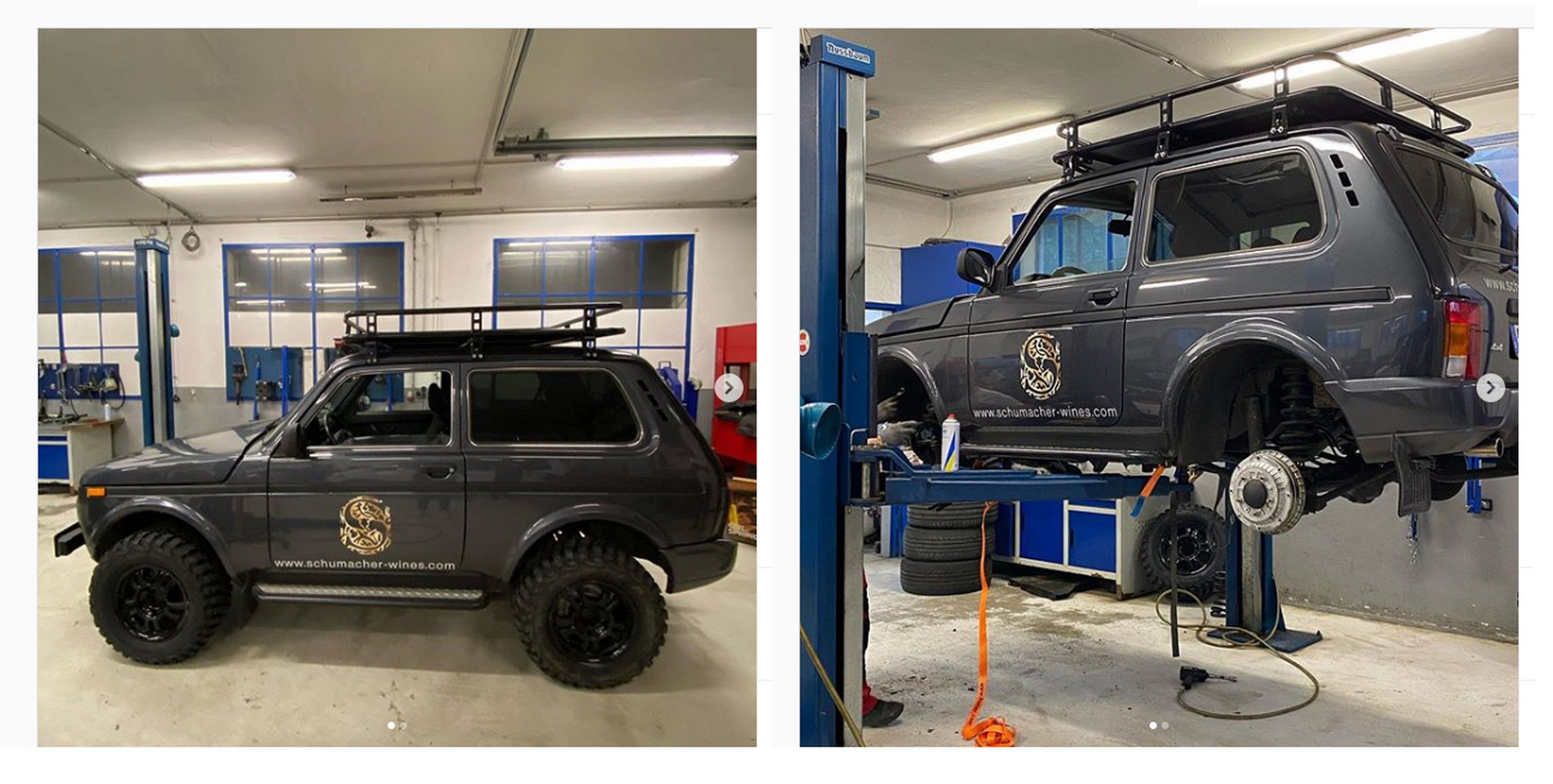 На первом фото "Нивы" с комментарием в стиле “не могу дождаться, когда прибудет мое новое авто”, а на втором фото Нива уже с прицепом, на котором нанесен логотип его компании Schumacher Wines (хобби Шумахера производить собственное вино).