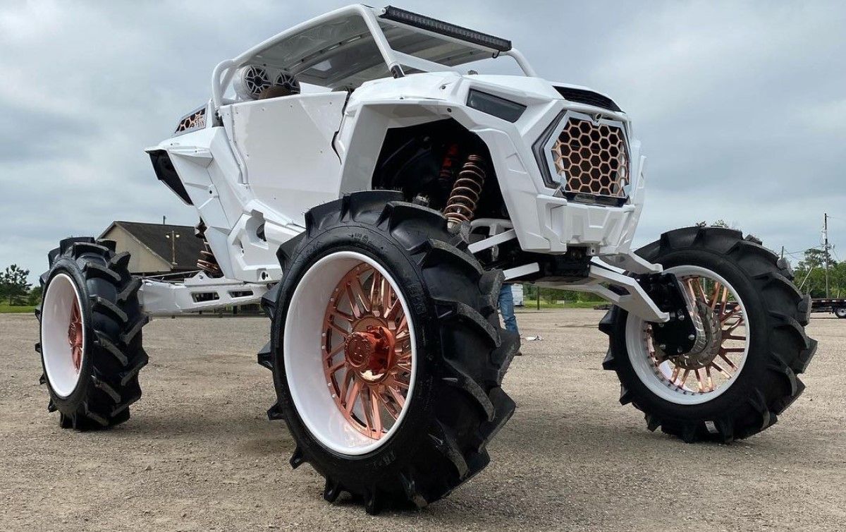 Кроме того, RZR на рынке уже достаточно долго и достаточно популярен, чтобы для него появились комплекты тюнинга не только от Polaris, а и от сторонних фирм. И примеров мы уже видели немало. Но белоснежный RZR на 20-сантиметровых портальных мостах, “медных” 30-дюймовых дисках Forgiato и тракторных шинах – это нечто особенное.