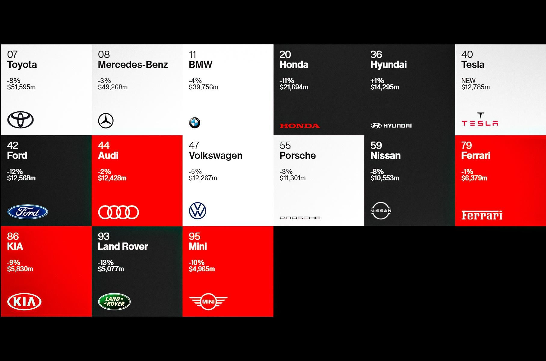 В 2020 году в него вошли 15 автопроизводителей: лидером оказалась Toyota, цена на которую упала в сравнении с прошлым годом, а новичок в списке, компания Tesla, дебютировала сразу на шестом месте.