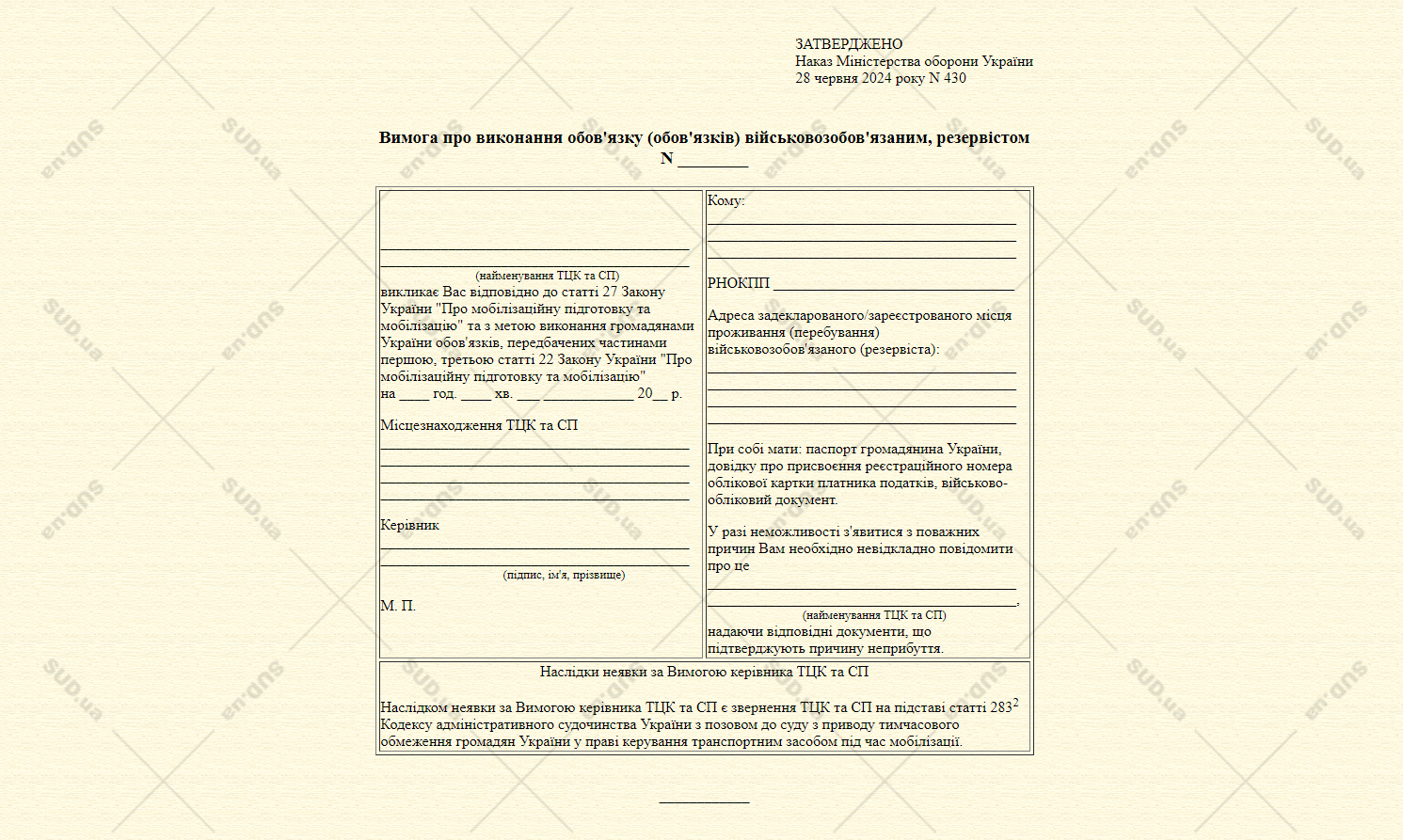 6 августа вступил в силу приказ Минобороны от 28 июня 2024 года №430, которым утверждена форма и содержание требования ТЦК о выполнении обязанности военнообязанным или резервистом.