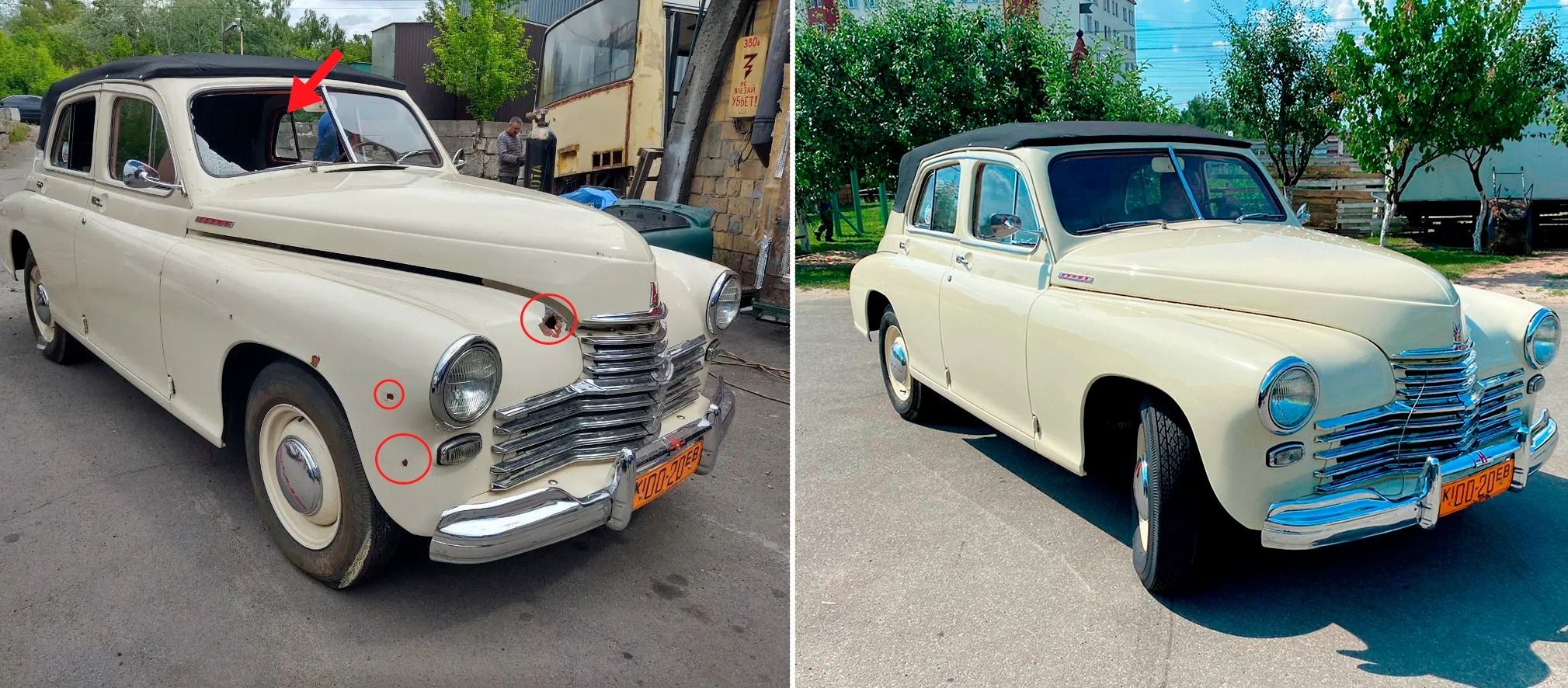 Некоторые ценные экземпляры были целиком уничтожены, другие – повреждены с разной степенью тяжести. Но этому кабриолету ГАЗ повезло – он был “ранен”. В результате боевых действий он получил такие повреждения: пробитый радиатор, дыры и царапины кузова, выбитые окна, искалеченный салон…