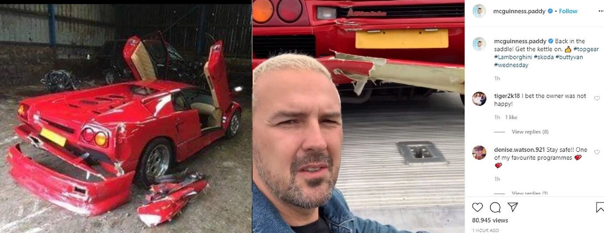 В момент ДТП соведущие Макгиннесса – Эндрю Флинтофф и Крис Харрис, ехали рядом на Jaguar XJ220 и Ferrari F40. Эти автомобили не пострадали, поэтому режиссеры решили продолжить съемки, а разбитый Diablo заменили старой Skoda Octavia.
