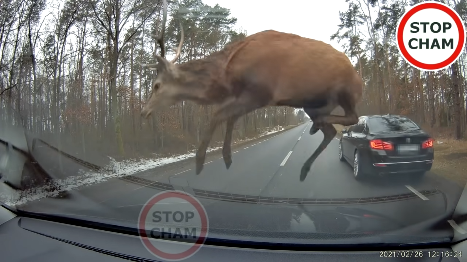 В видеоролике, снятом в Польше, черный BMW двигался по двухполосной дороге на скорости около 80 километров в час, когда ему наперерез из леса выскочило стадо диких оленей. Водитель BMW резко нажал на тормоз, сумев избежать столкновения с несколькими самыми быстрыми животными, однако некоторые из них все же наскочили на автомобиль.