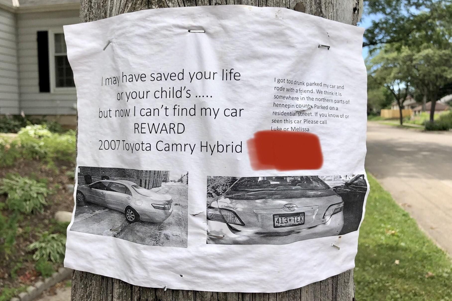 В объявлениях о пропаже он объяснил, что накануне перебрал с алкоголем, поехал домой на машине своего друга и напрочь забыл место парковки. Листовки с фотографиями криво припаркованного седана 2007-го года появились на деревьях и столбах по всему городу. "Возможно, я спас вашу жизнь или жизнь вашего ребенка... Но теперь я не могу отыскать свою машину. Я слишком много выпил, припарковал ее и поехал с другом", – гласит текст объявлений. Наверное, владелец работает врачом.
