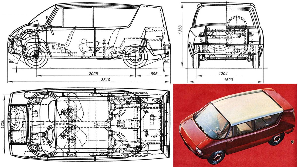 Да, вагонная компоновка автомобиля имеет весомые преимущества, но и специфических проблем конструктору она добавляет немало. Но скажем, что и как дизайнер, и как конструктор Ю. Долматовский вместе с коллегой В. Арямовым со всеми ними справился. Например, каким-то чудом соавторам удалось спроектировать компактвэн одновременно коротким и низким – то есть в габаритах "горбатого" ЗАЗ-965. При том что обычно компактные однообъемники приходится делать выше аналогичного седана, поскольку часть механизмов конструкторы вынуждены прятать под пассажирским отсеком.
