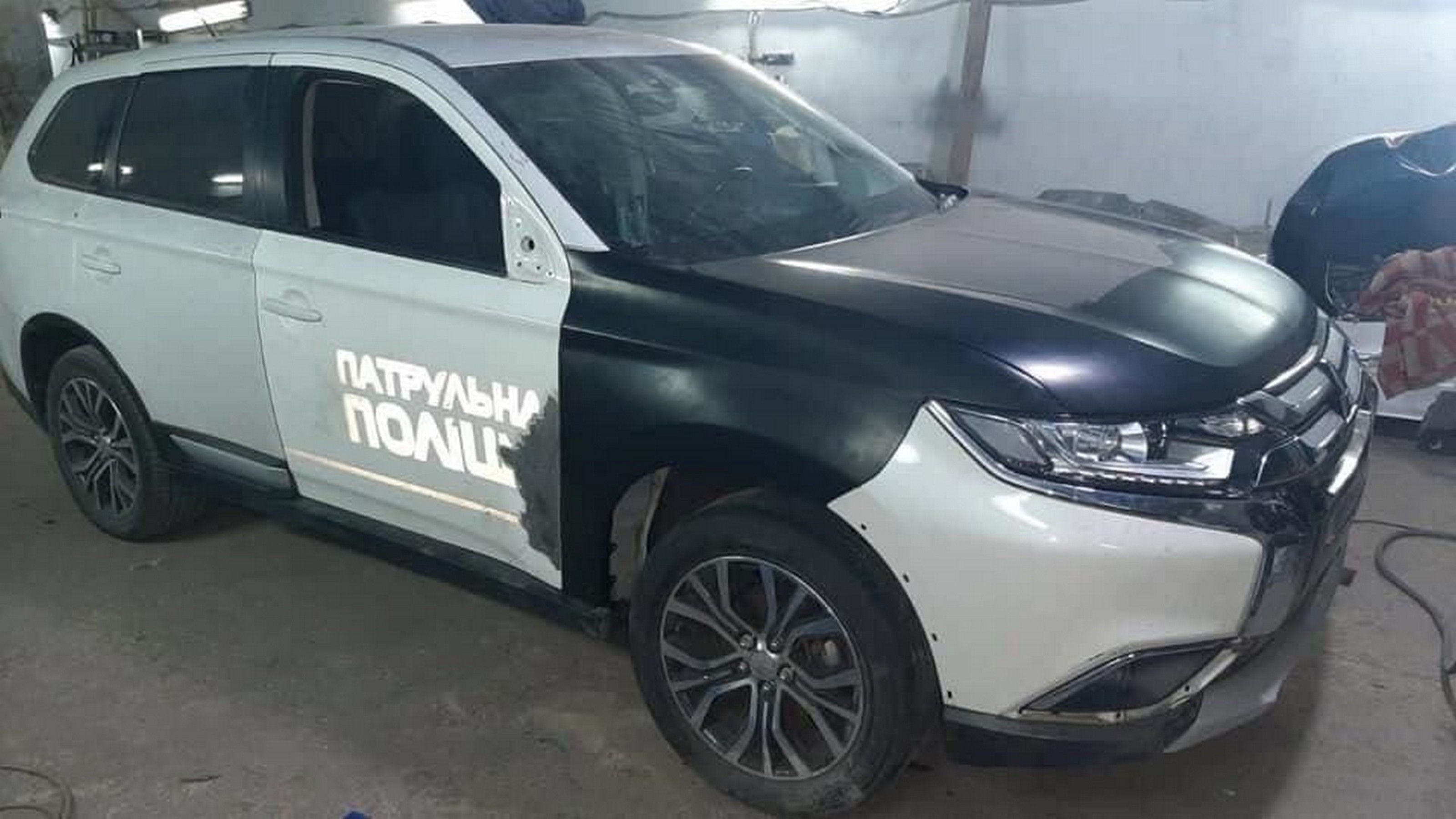 На большую Mitsubishi Outlander поставили двери от полицейской машины. Фото машины опубликовал пользователь соцсети Алексей Павловский. Как видно, на кроссовер Mitsubishi Outlander, который находится на стадии восстановления, установили двери от кроссовера Mitsubishi патрульной полиции Украины.