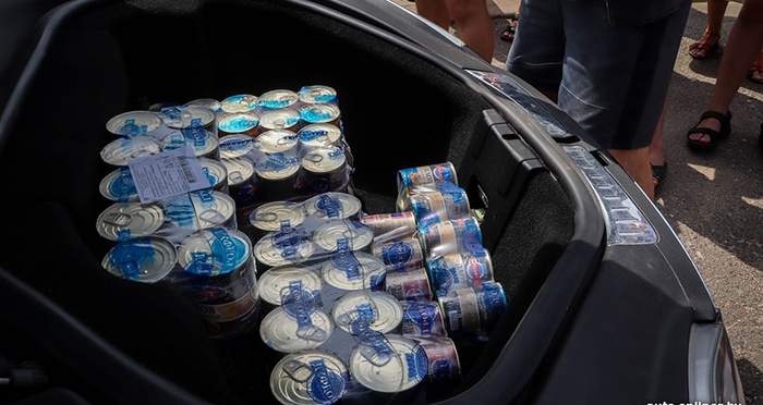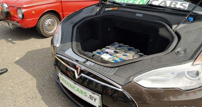 В этой "битве года" победил "Запорожец". Правильная форма переднего багажника Tesla позволила разместить там лишь 31 упаковку – это 310 банок. А вот в ЗАЗ багажник оказался не столь "правильным", зато более вместительным – в него вошло 36 упаковок.