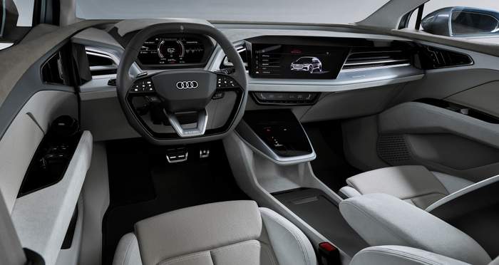 Интерьер электрокара Q4 e-tron предлагает четырехместный салон с отделкой кожей или эко-материалами, цифровую панель приборов, крупноформатный проекционный дисплей с функцией дополненной реальности и большой сенсорный экран мультимедийной системы с широкими возможностями для подключения устройств и работы с приложениями. Центральный тоннель оказался "пустым", поскольку рычаг коробки передач больше не нужен. Выбор режима движения или парковки осуществляется на специальной панели, которая "висит" в воздухе.