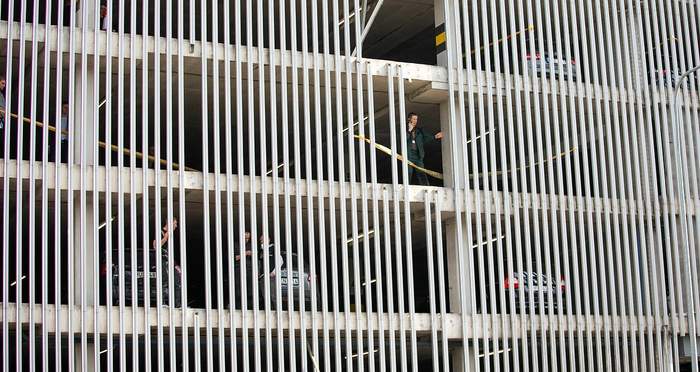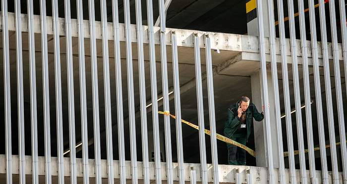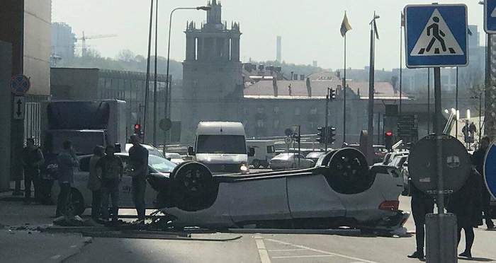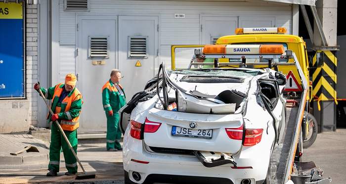 В торговом центре Europa, что в Вильнюсе, водитель BMW X5 не справилась с управлением и выпала из многоэтажного паркинга. По предварительным данным, женщина перепутала передачи или педали и в результате кроссовер пробил ограждение автостоянки и упал, приземлившись на крышу.