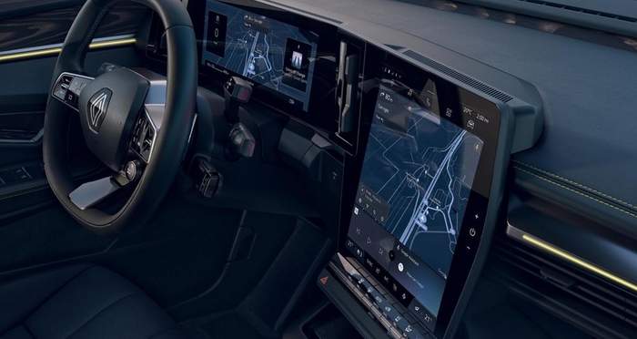 Megane E-Tech имеет выдвижные ручки передних дверей и скрытые ручками для задних дверей. Спереди можно видеть тонкую линейную оптику с угловыми линиями ДхВ, а также большой новый логотип Renault. Внутри почти всю переднюю панель занимают экраны. Минимум физических кнопок. Также привлекает внимание "квадратный" руль, который, кажется, является новой тенденцией в автомобильном мире сегодня.