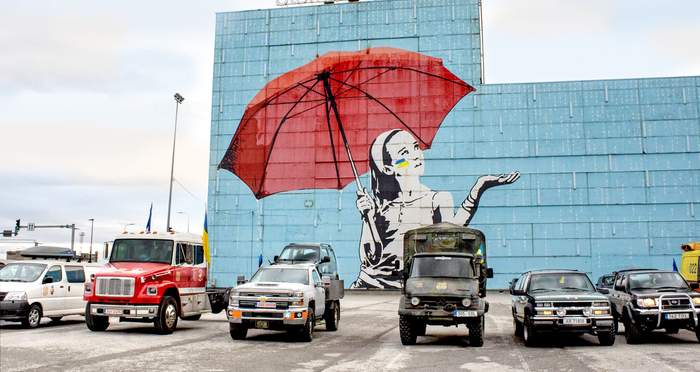 У Таллінні колона машин стартувала з паркувальної зони Ülemiste City, де на фасаді приміщення видніється зображення дівчинки з червоною парасолею та з жовто-блакитною наліпкою української символіки на правій щічці. Фото: Anna Mishina