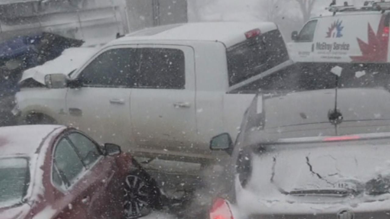 На відео, знятому свідками, можна побачити, як автомобілі щосекунди виринають зі сніжної завіси і не встигаючи загальмувати, розбиваються об тих, хто ще мить назад сам врізався в іншу машину.