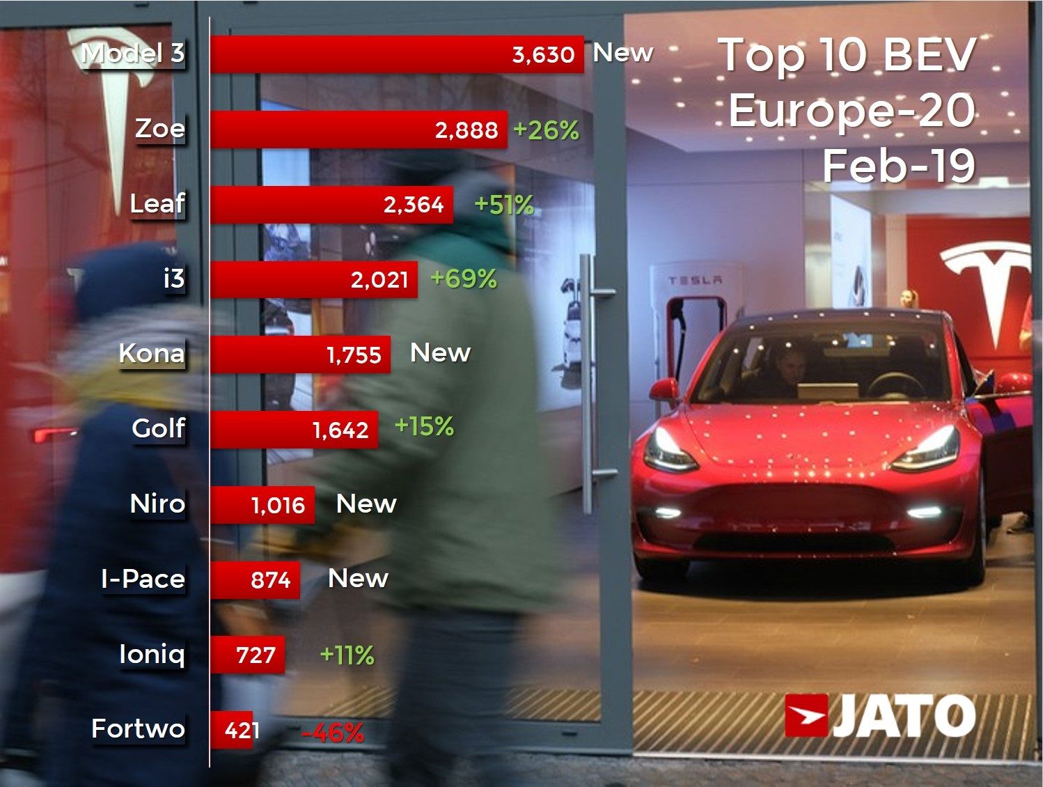 Реультати продажів нових електрокарів у Європі в лютому 2019 року