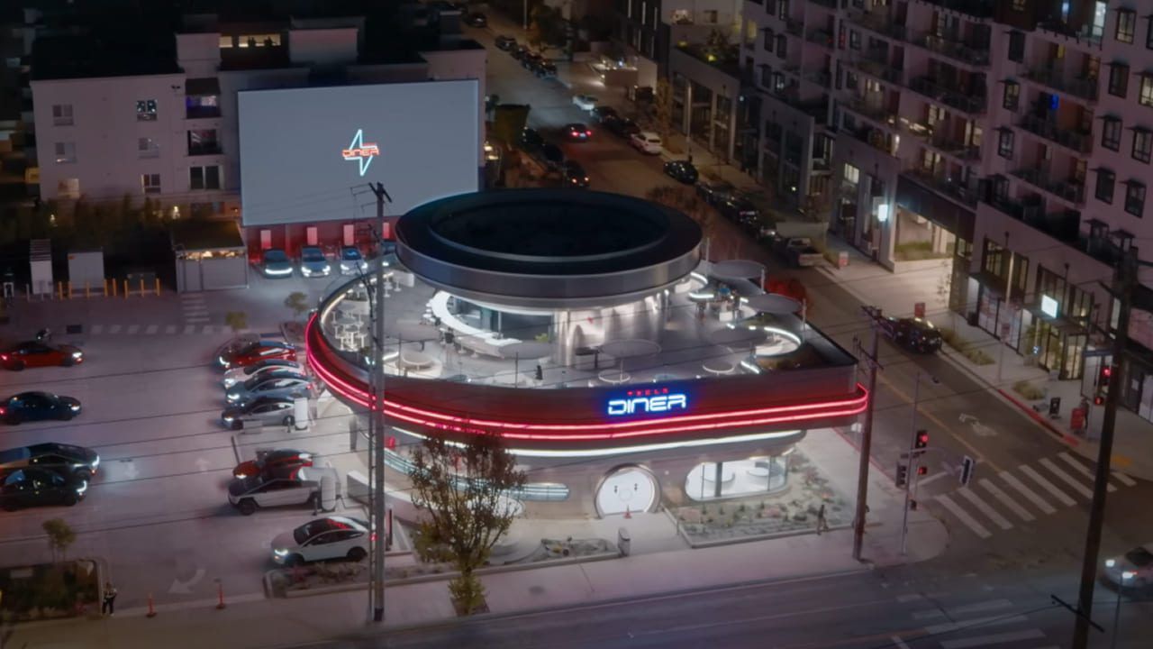 Заклад поєднує в собі ретро та футуристичний стиль. На першому поверсі є численні зарядні станції Tesla Supercharger та два величезні кіноекрани. На даху гості можуть перекусити в закусочній.