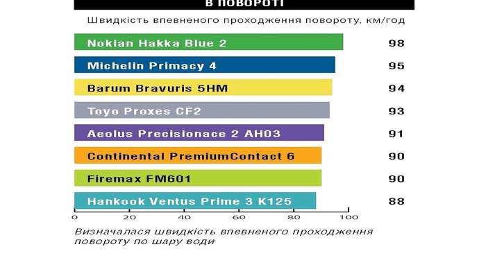 У цієї шини непогана стійкість до аквапланування на прямій, але на поворотах в цій дисципліні Ventus Prime 3 K125 опинився в аутсайдерах.