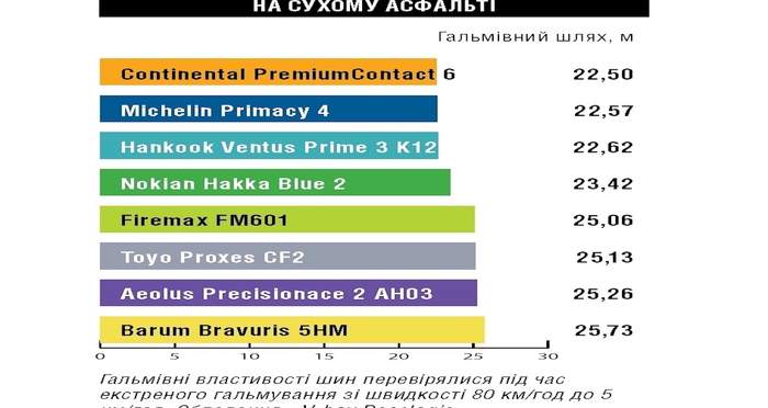 Переможцем тесту в рейтингу "безпека" стала шина Continental PremiumContact 6, яка показала кращі гальмівні властивості, забезпечує кращу керованість на мокрому і сухому асфальті, а також має гарні властивості в інших тестових дисциплінах.