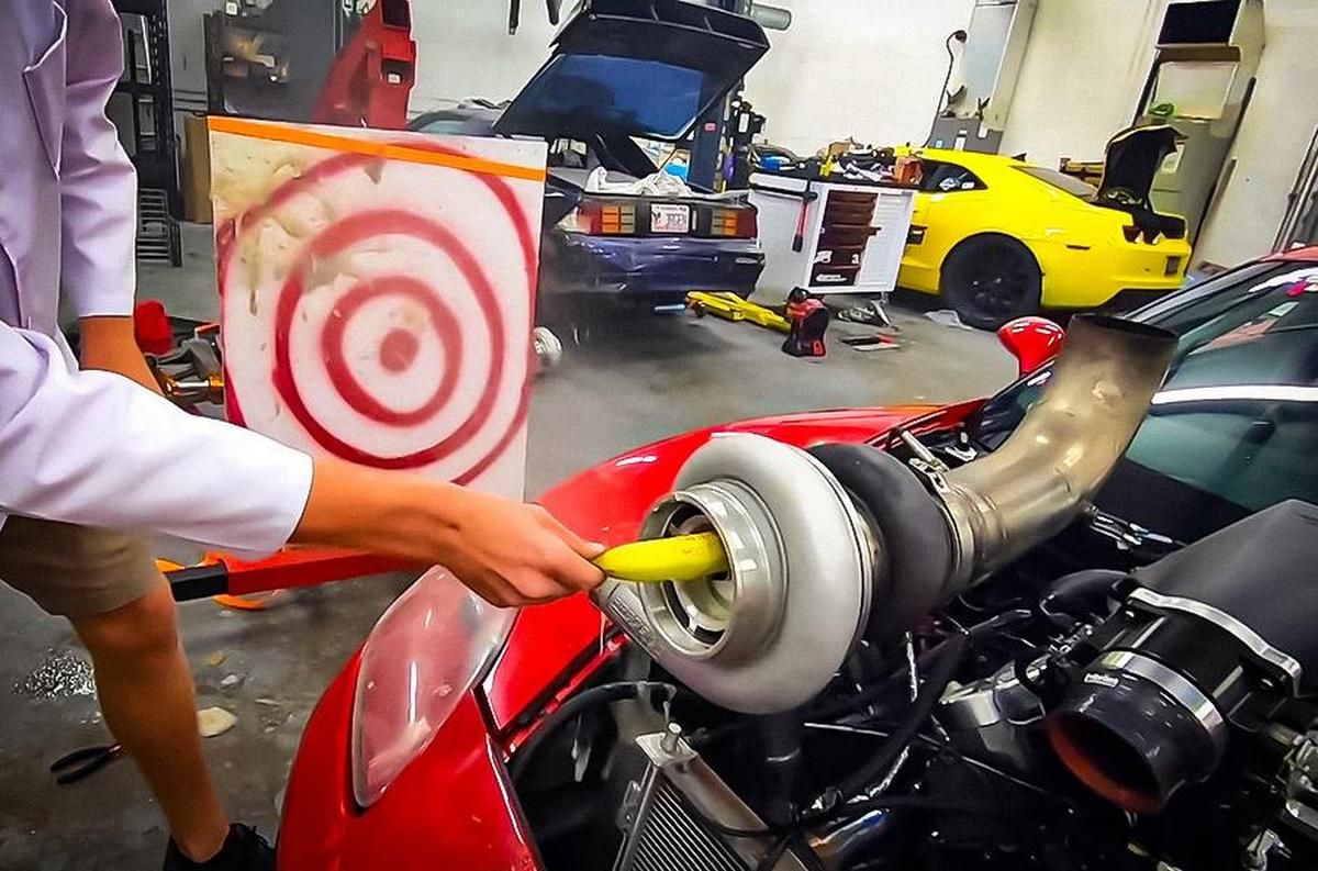 Для проведення експерименту автори ролика використовували 1300-сильний гоночний мотор Chevrolet Corvette. Турбіна Precision Turbo забезпечує дреговому спорткару до 30 000 обертів на хвилину, з якими він проходить 402 метри за сім секунд.