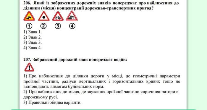- питання № 206: "Який із зображених дорожніх знаків попереджає про наближення до ділянки (місця) концентрації дорожньо-транспортних пригод?";