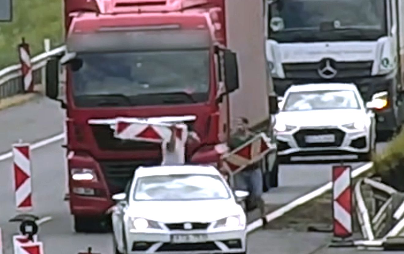 На записі видно MAN TGX у лівій смузі перед звуженням дороги. Mercedes-Benz Sprinter наближається по правій смузі і, мабуть, в останню хвилину має намір зупинитися прямо перед вантажівкою.