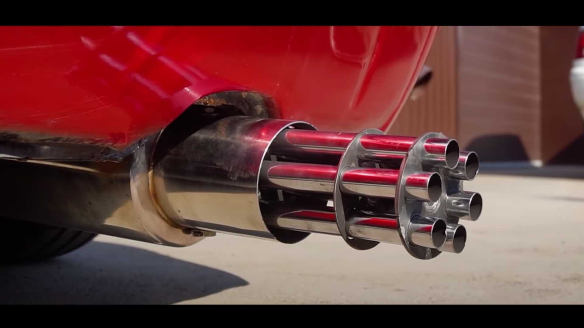 Витративши чимало людино-годин і цілий виробничий комплекс обладнання, ютубери створили випуск, що нагадує мініган – багатоствольний швидкострільний кулемет. Під час роботи мотора та проходження вихлопних газів вбудована у вихлоп турбіна приводить у рух диск з шістьма тоненькими патрубками.