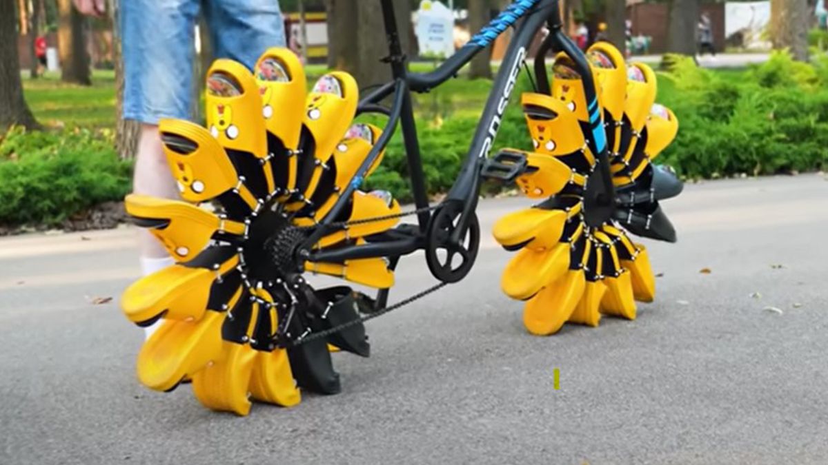 Фантазія інженера-дивака, котрий у свій час показав світу трикутні, квадратні і навіть гусеничні колеса на рамі класичного велосипеда, не залишила без уваги пляжні капці. Винахідник вирішив з них зробити велосипедні шини. І зробив.