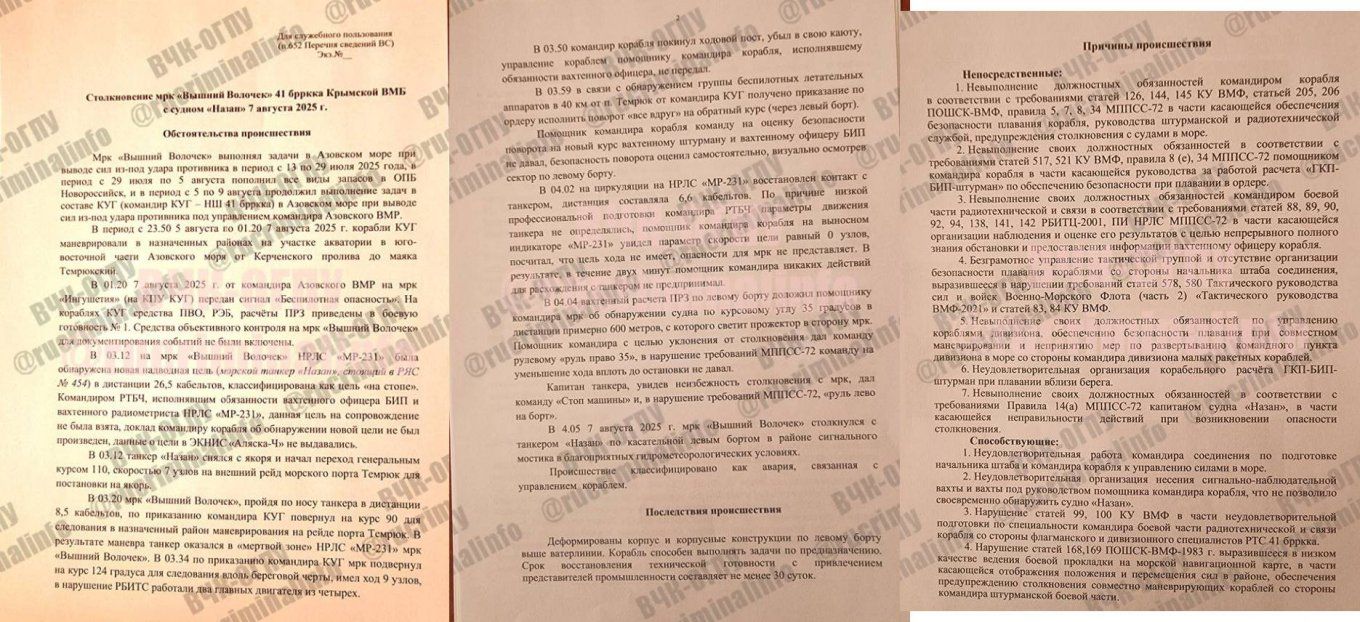 І хоча росіяни намагалися приховати факт пошкодження корабля в небойовому інциденті, у мережу все ж "спливли" відповідні документи – схема маневрування судна, фото його пошкодження та звіт капітана 1-го рангу Олега Сардіна з деталями аварії.