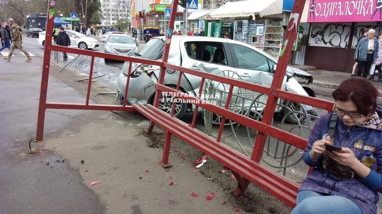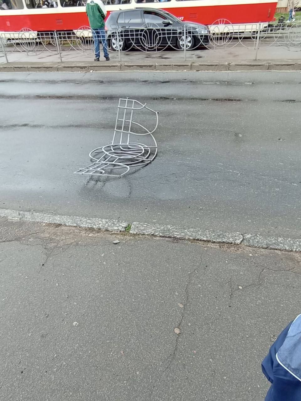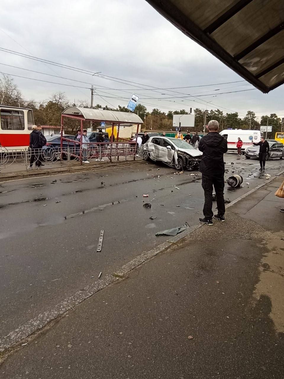Як зрозуміло із фото, одну з автівок після удару відкинуло в бік трамвайної колії. Авто знесло кілька секцій металевої огорожі, пошкодило конструкції зупинки. Сильно пошкоджено і саму машину. Друга також сильно пом'ята.