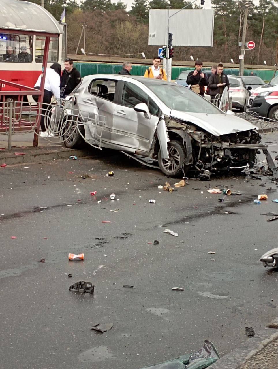 Від удару машину розвернуло в бік трамвайної зупинки: дивіться відео наслідків ДТП у Києві