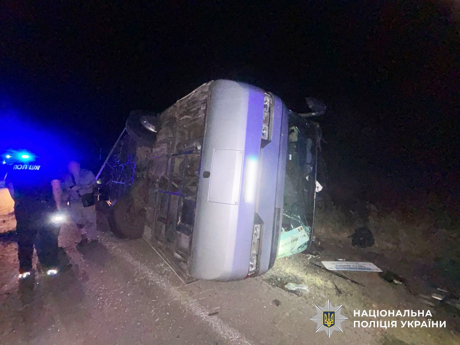Аварія сталася близько 2:40 ночі на автодорозі Н-11 Дніпро – Миколаїв неподалік від міста Баштанка. За попередніми даними, водій автобуса, що здійснював регулярні пасажирські перевезення, втратив контроль над транспортом, виїхав на зустрічну смугу, після чого автобус перекинувся.