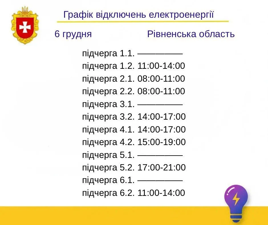 Із графіком погодинних відключень і номером вашої черги можна ознайомитися на сайті Рівненської ОДА та сайті Рівнеобленерго.