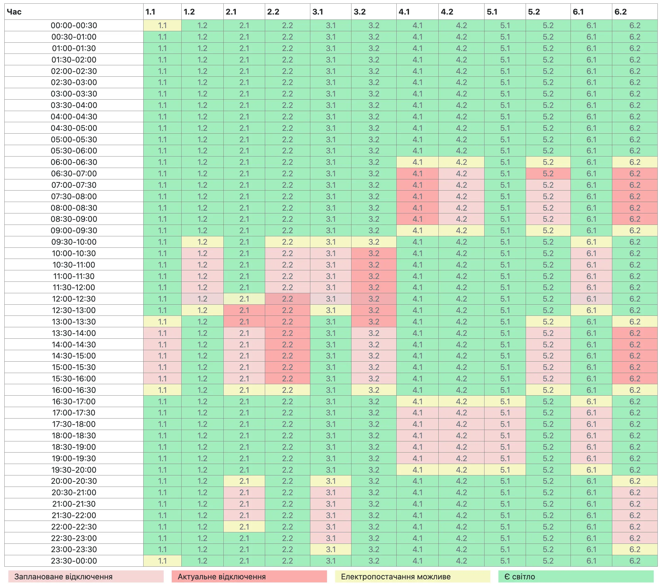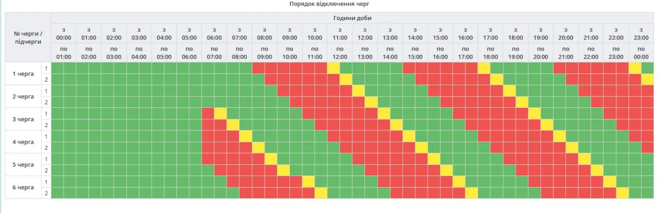 Світла не буде у споживачів усіх підчерг по 1 – 2 рази за день. ГПВ матимуть такий вигляд: