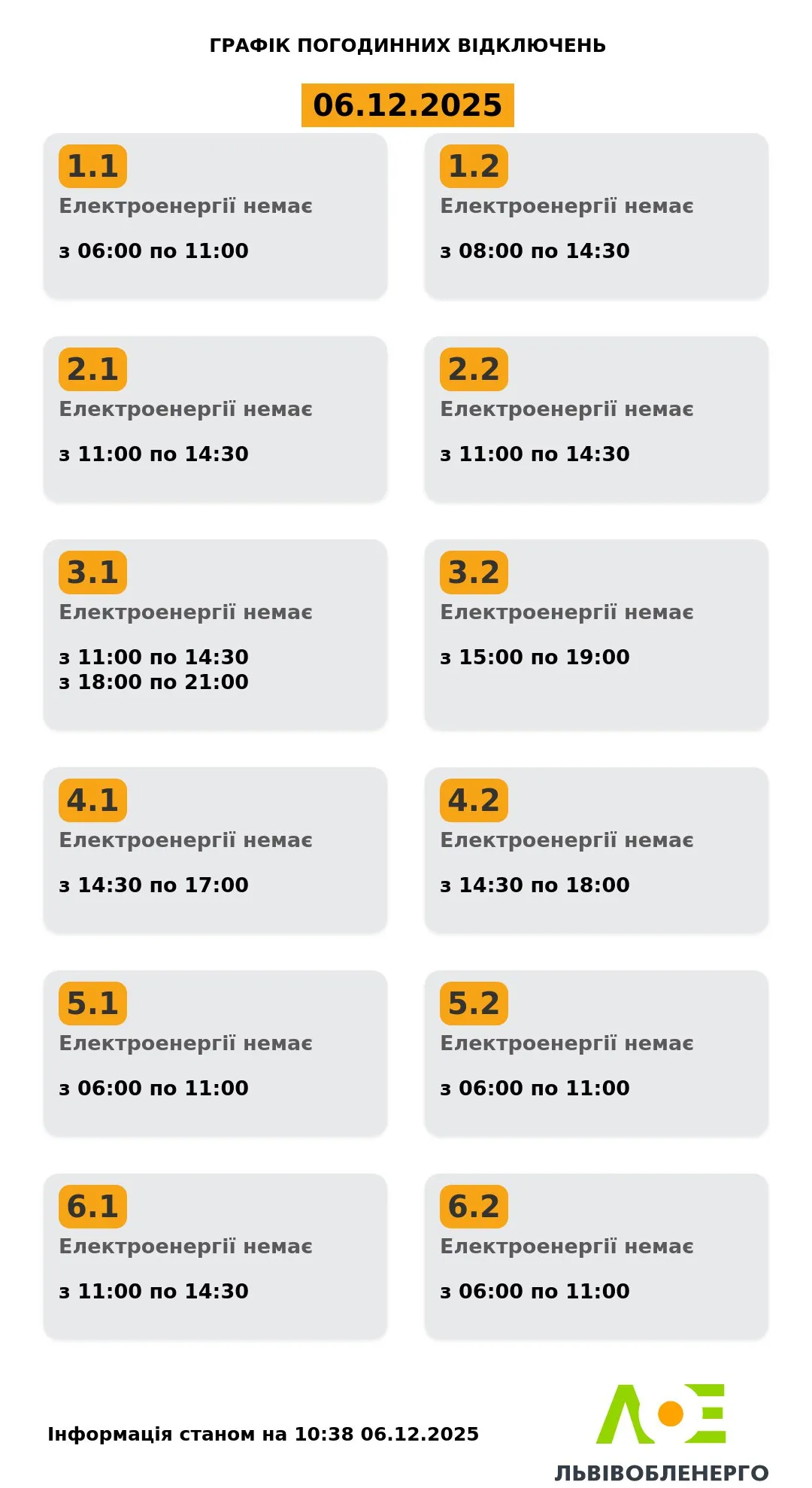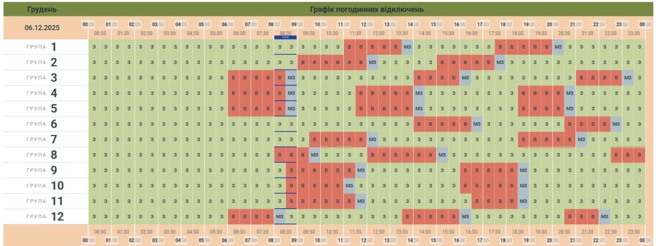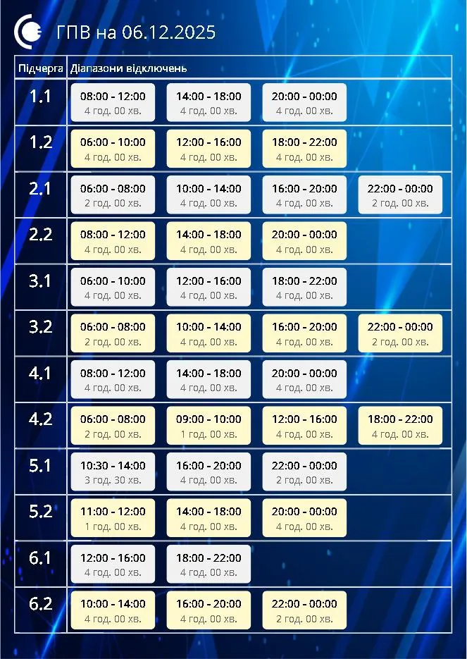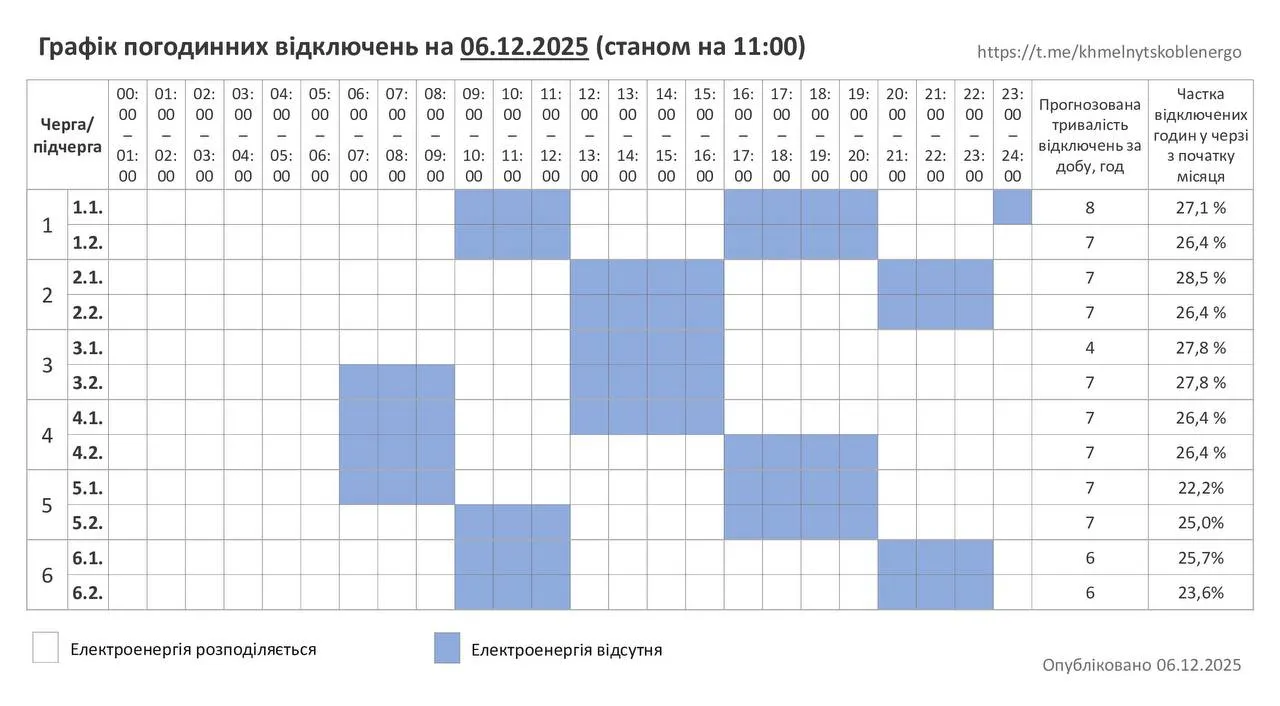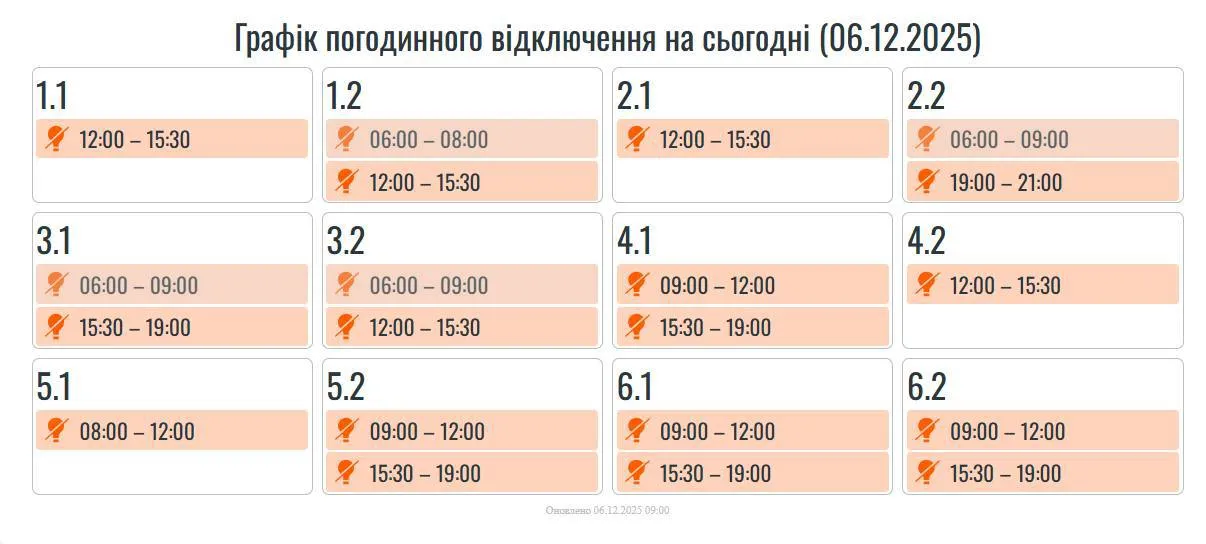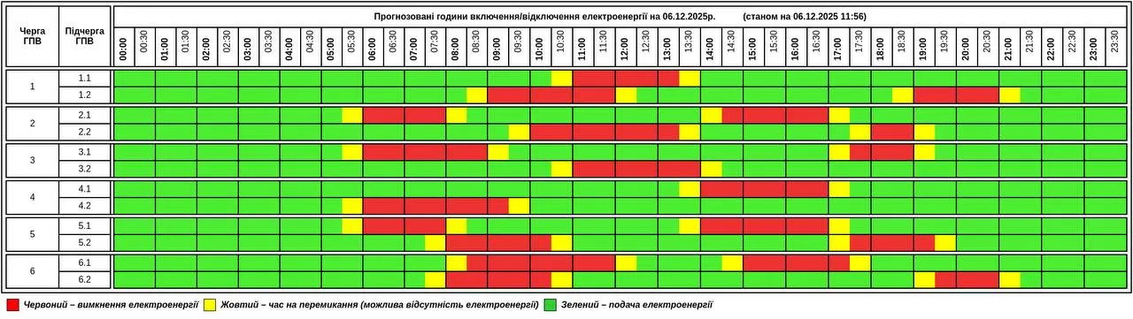 Погодинні графіки 6 грудня діятимуть з 06:00 до 23:59: