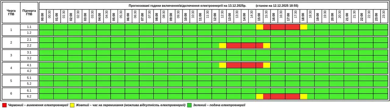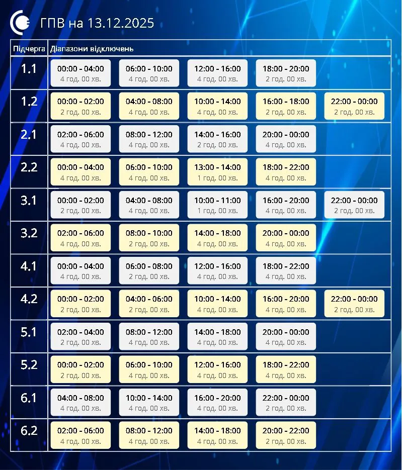 За даними ДТЕК, ГПВ 14 грудня діятимуть на Дніпропетровщині. Обмеження впродовж доби торкнуться усіх черг.