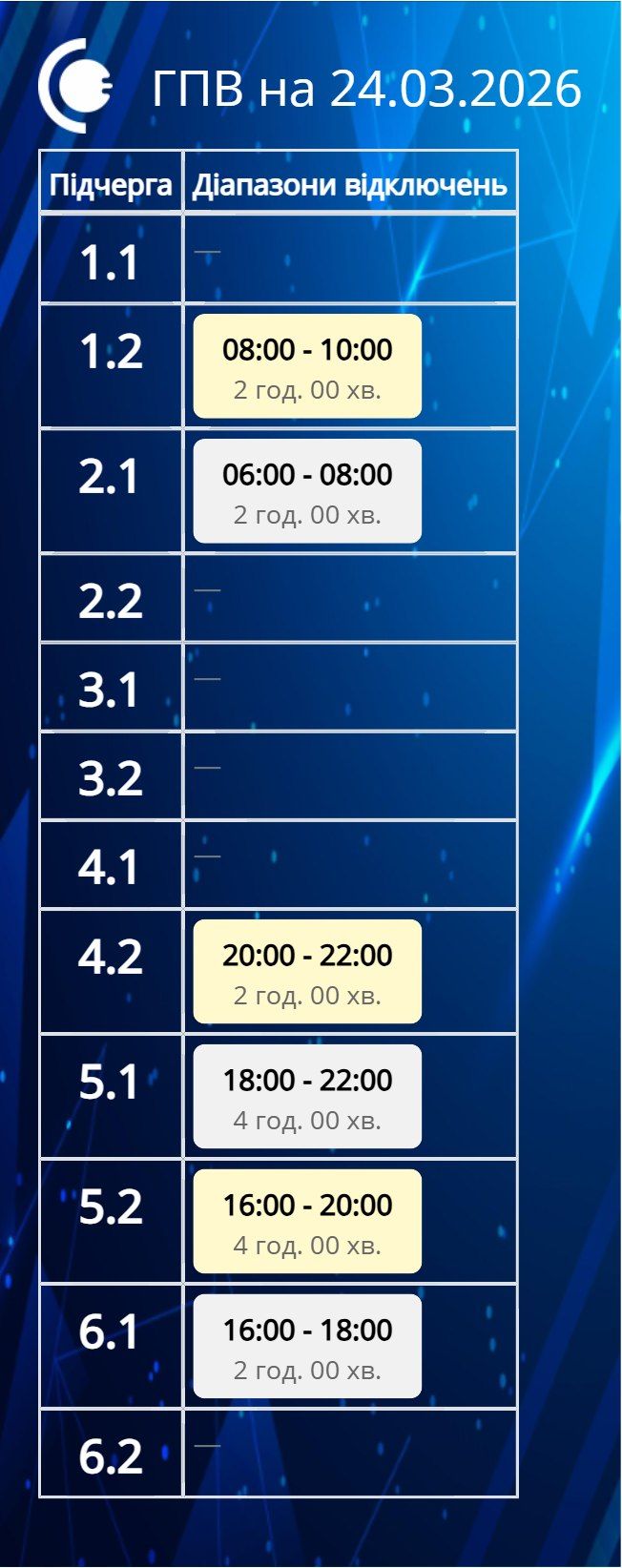 Години вимкнень, попередньо, такі:
