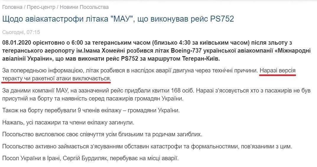 Однак згодом повідомлення було відредаговане. У новій версії йдеться про те, що інформація щодо причин авіакатастрофи з'ясовується комісією.