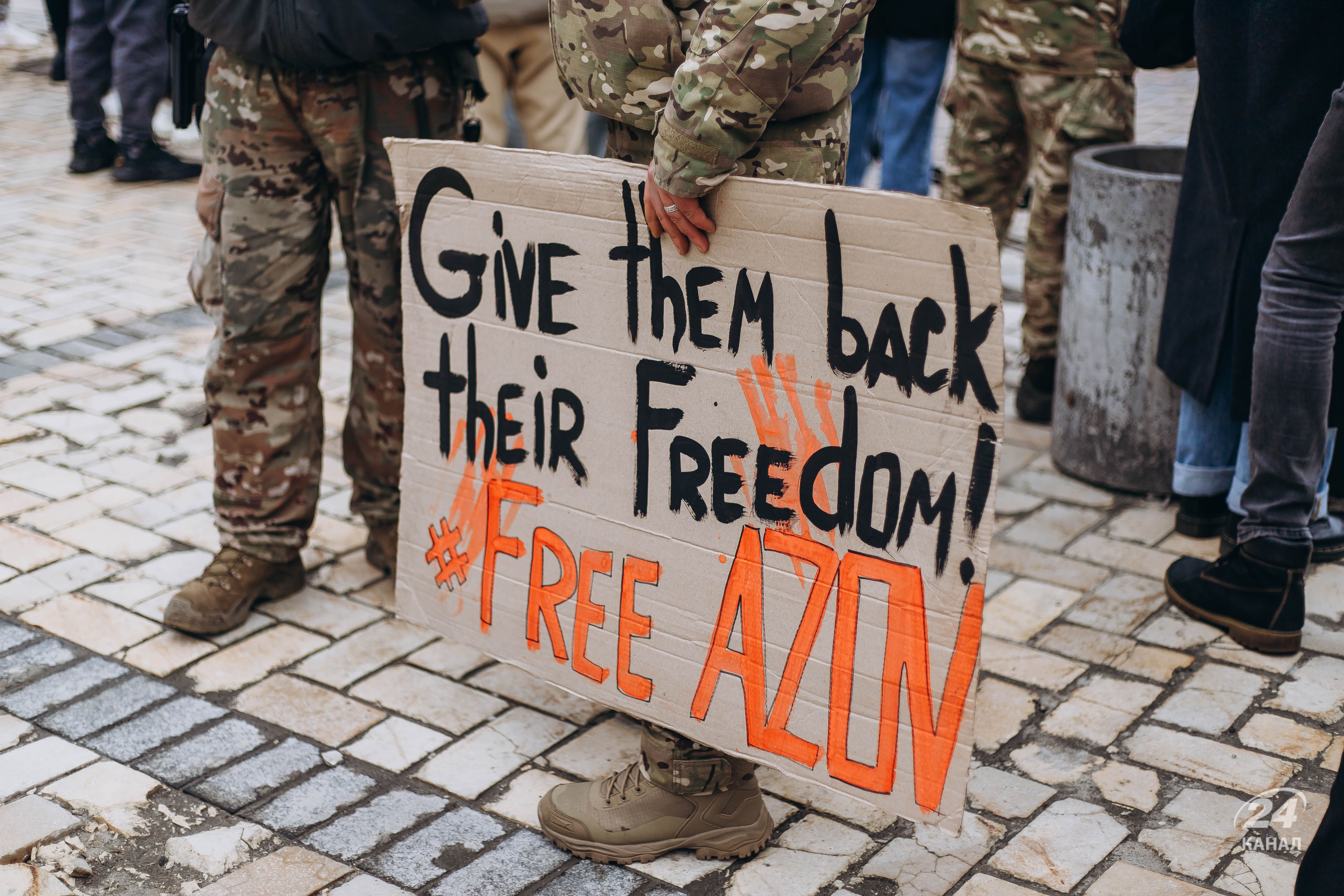 Десятки людей вишикувалися у живий ланцюг плакатами-закликами звільнити "азовців". На табличках киян були викарбувані написи "Вони там, бо захищали нас. Пам'ятай це", "Коли я побачу рідні очі?", "Полон – це пекло, звільніть AZOV", "Прямо зараз хтось під тортурами".