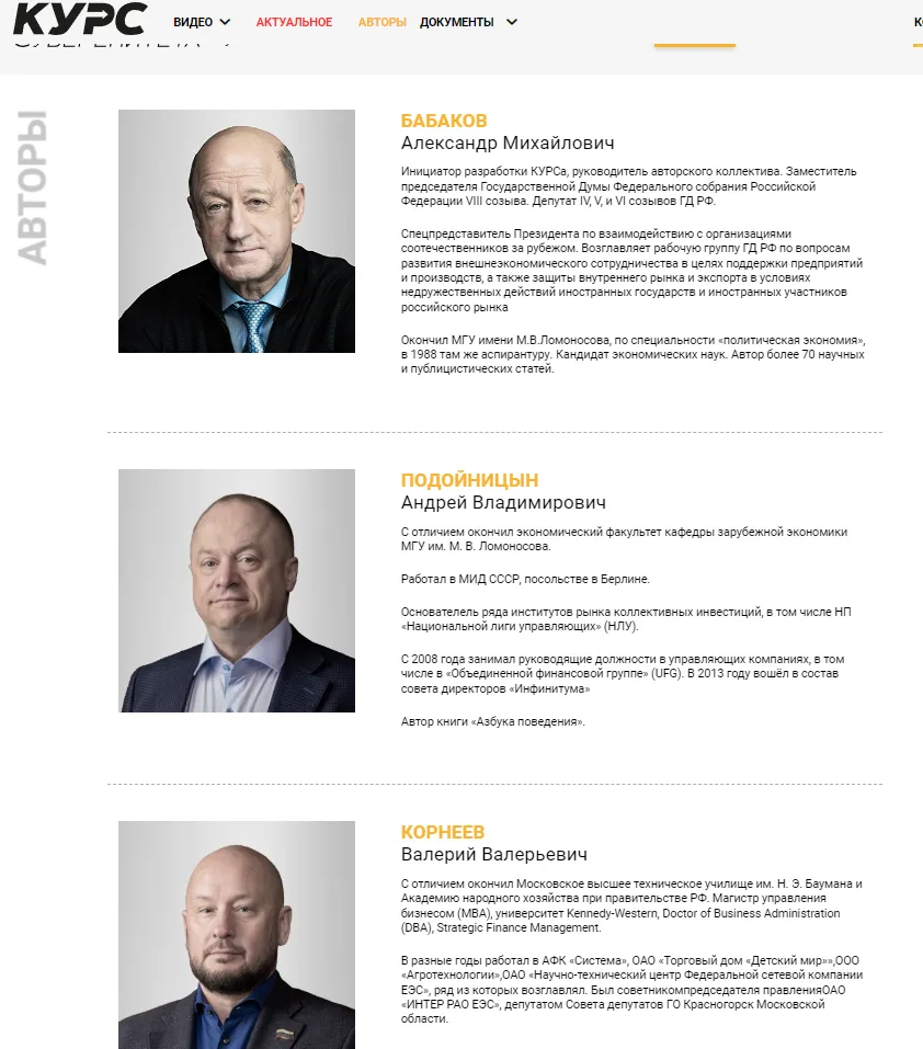 Згідно з відкритими даними, ініціатором КУРСу є сам Бабаков, а авторами концепції – воєнний злочинець та депутат Андрій Подойніцин, а також псевдофінансист та екскерівник фонду путінських байкерів "Нічні вовки" Валерій Корнєєв. Саму ж програму путінський посіпака представляв як "власне бачення макроекономіки, що спирається на сучасну політекономічну теорію".
