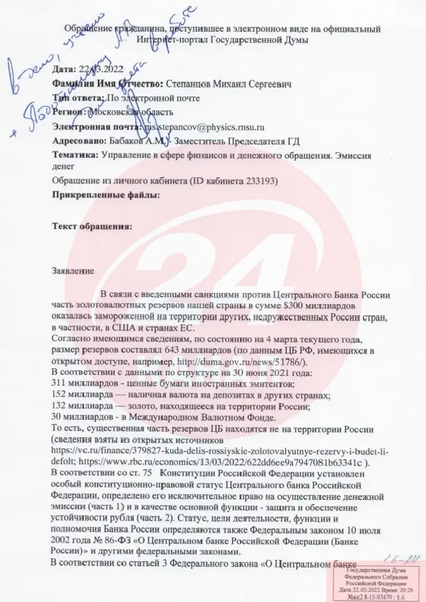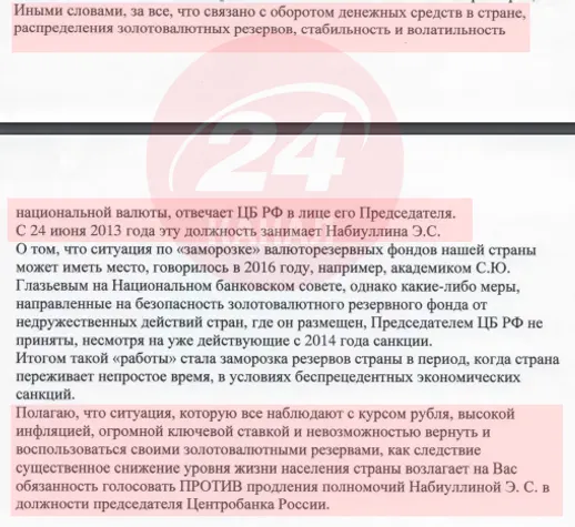 Перші наміри, націлені у цей бік, з'явилися на пошті Бабакова 28 березня 2022 року, коли воєнному злочинцю абсолютно "випадково" перенаправили звернення громадянина з повним описом провальної роботи Набіулліної щодо вивезення активів з недружніх країн до початку війни. Про те, що йдеться саме про спробу розхитати крісло під очільницею фінансового регулятора, свідчить і офіційна реєстрація звернення у Держдумі, і резолюція самого діяча: "В дело. Учтем".