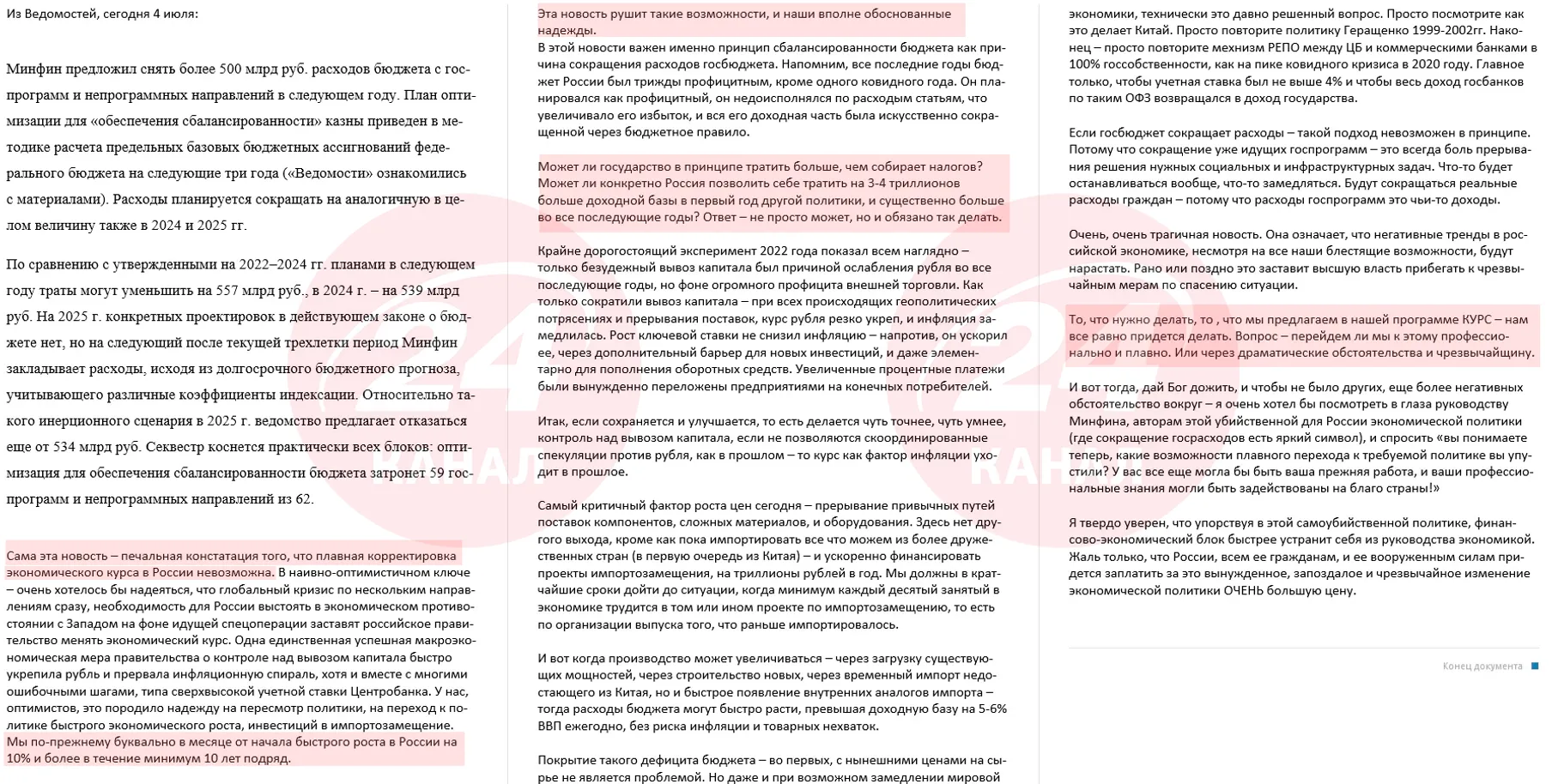 У квітні ж, коли Росія почала відверто не стягувати повноцінне фінансування війни та підтримку життєдіяльності, а мінфіну довелося урізати витрати на державні розходи, Бабаков написав свій коментар із цього приводу. Цей документ, судячи з усього, був призначений для осіб, які обіймають вищі політичні посади у Росії.