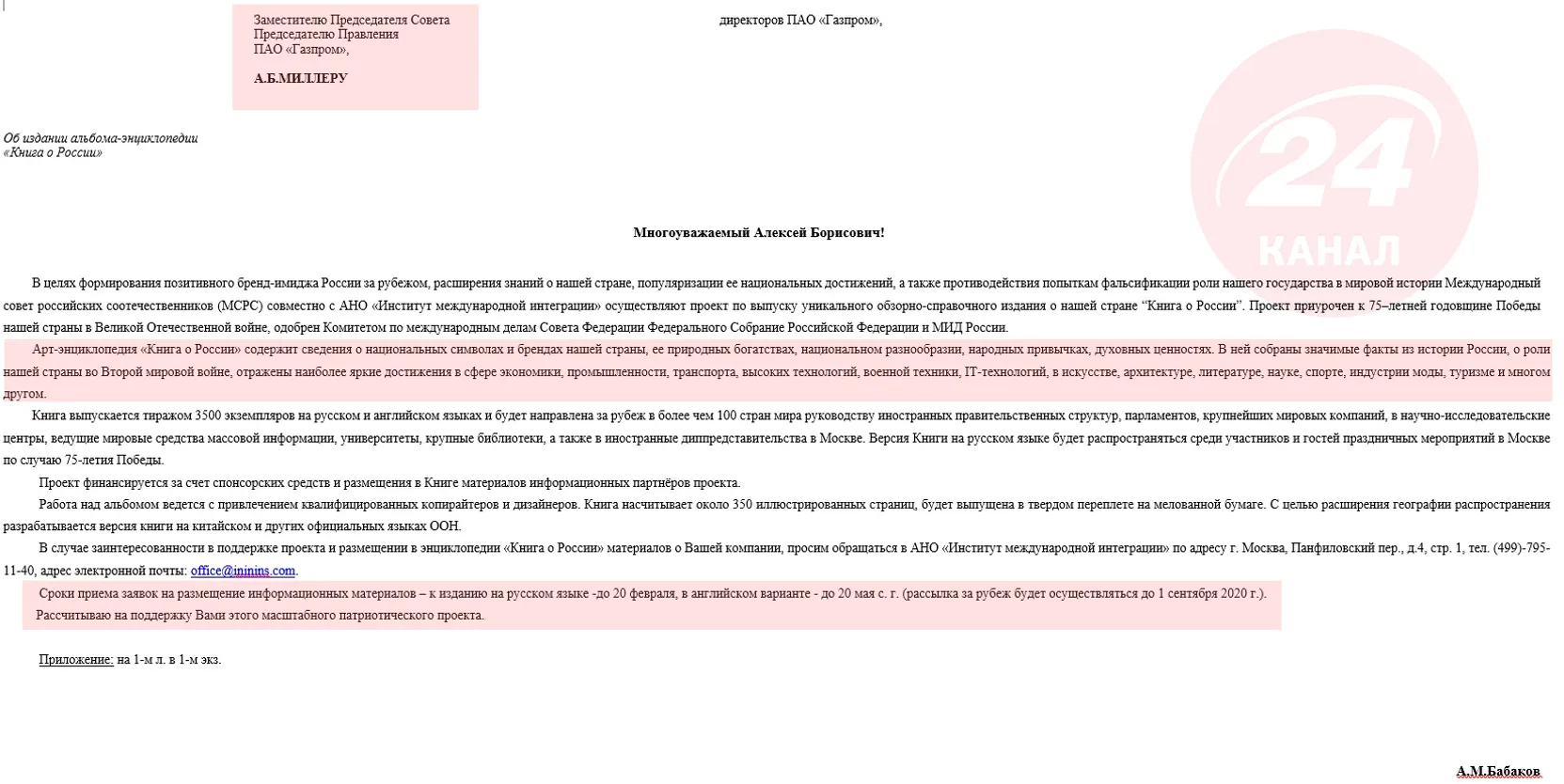 Пропозиція керівнику "Газпрому" вкластися у видання "Книги про Росію" / Скриншот із пошти терориста Бабакова