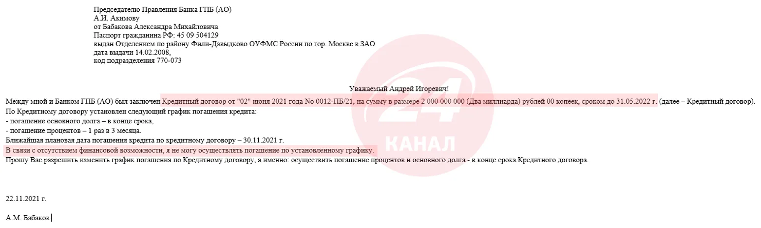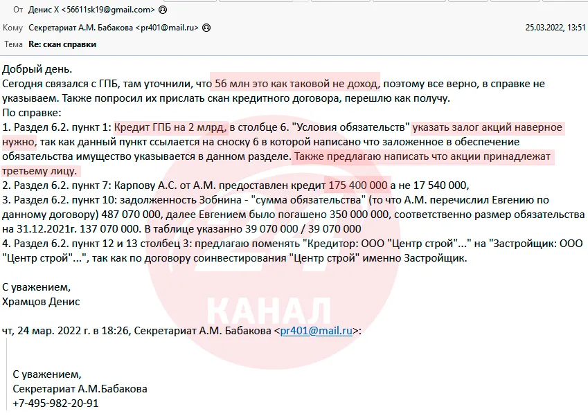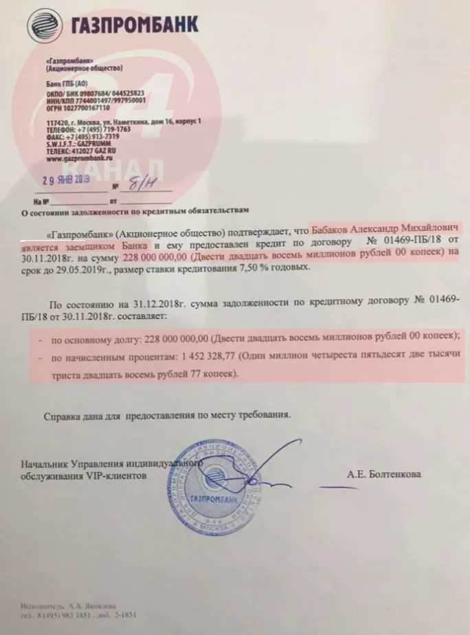 Довідка, що свідчить про наявність у Бабакова кредиту на 228 мільйонів / Скриншот із пошти путінського поплічника