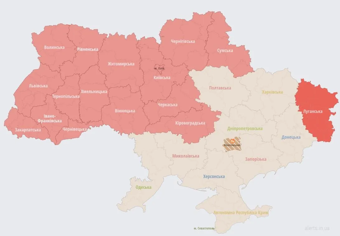Першу тривогу оголосили на Київщині та в самій столиці о 19:19. Невдовзі почали "червоніти" на карті й інші області. Невдовзі в мережі повідомили, що лунають вибухи на Рівненщині та на Волині. А відбої почалися орієнтовно за пів години.